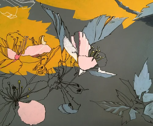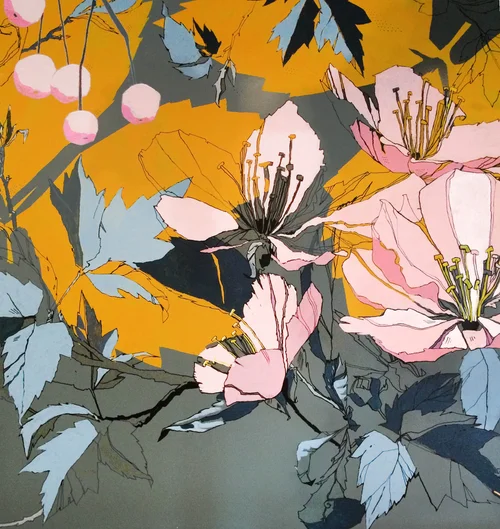 The main mural was inspired by the rich agricultural history of the local area. Hop, apple and cherry production have been very important to regional industry and still play a role in the local economy today. The aim was to create a composition of these botanical elements, depicting the rich mixture of wild and harvested fruit and flora found near Maidstone. Part of the process involved overlaying the individual drawings with graphic shapes and vibrant colours, in keeping with the overall colour scheme.